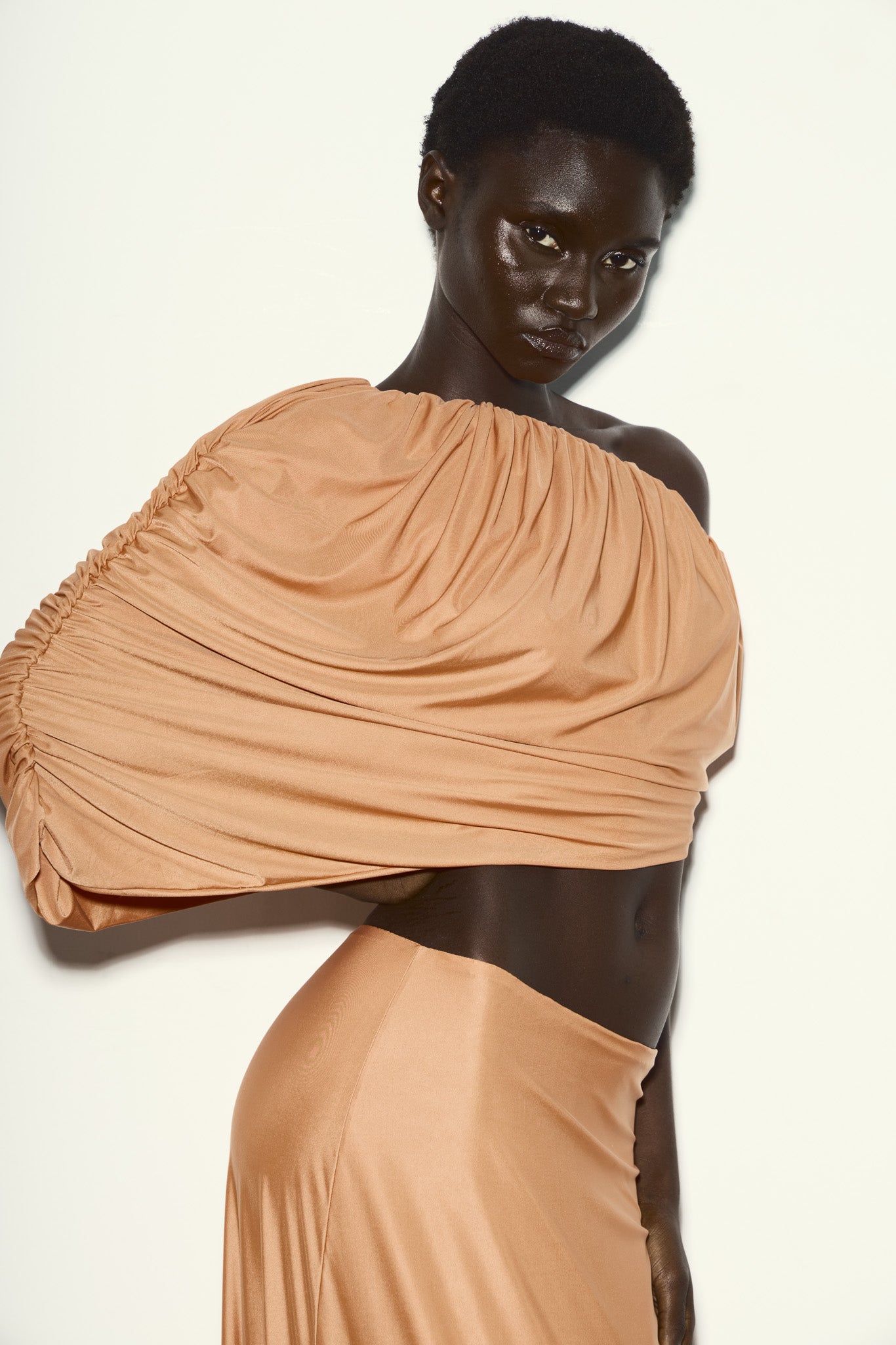 Blusa confeccionada em malha fluida laranja, acompanha top separado, confeccionado no mesmo tom, garantindo conforto, segurança e opacidade sem interferir na construção da peça principal. Uma proposta moderna, com presença e fluidez na medida.