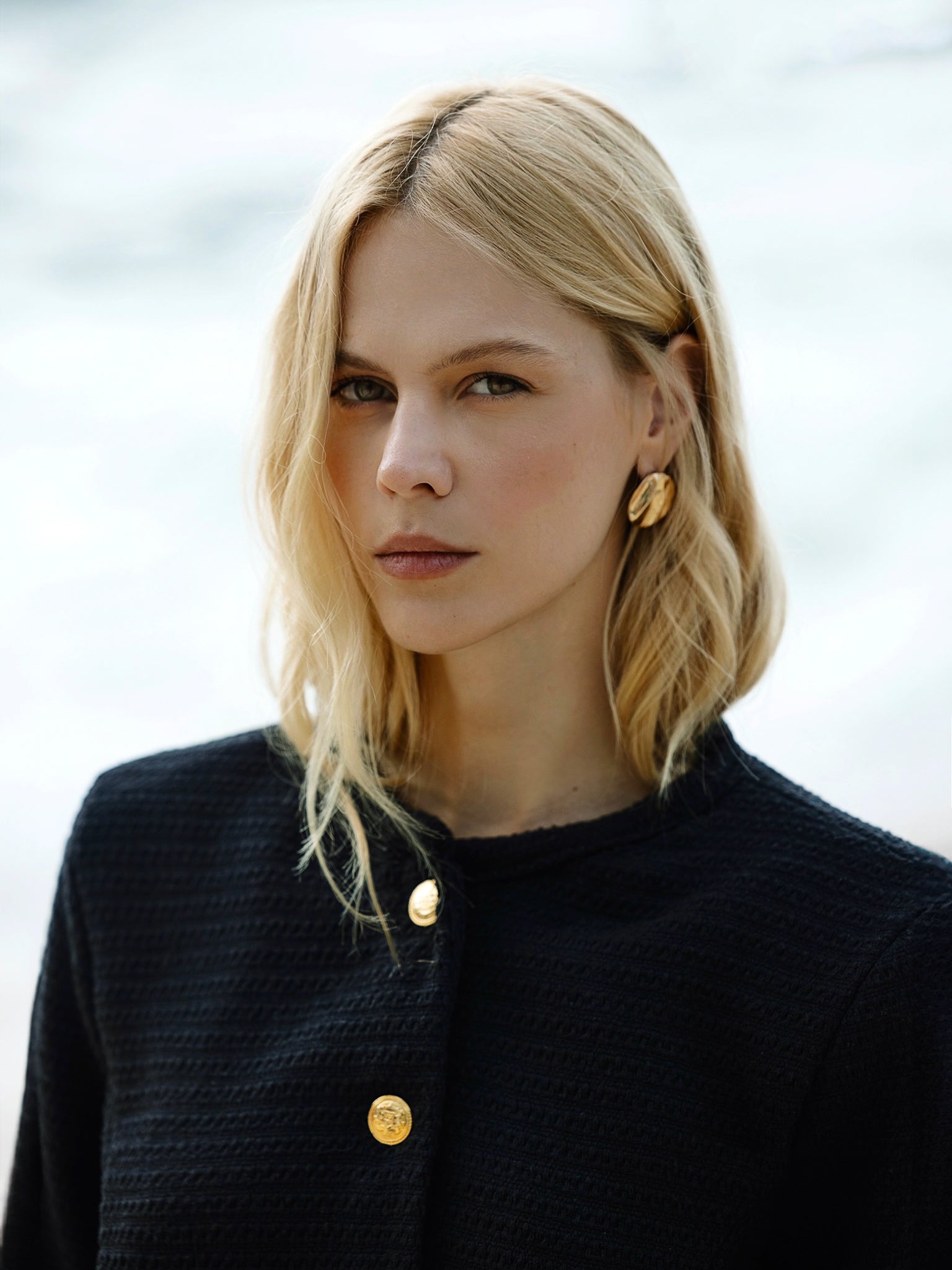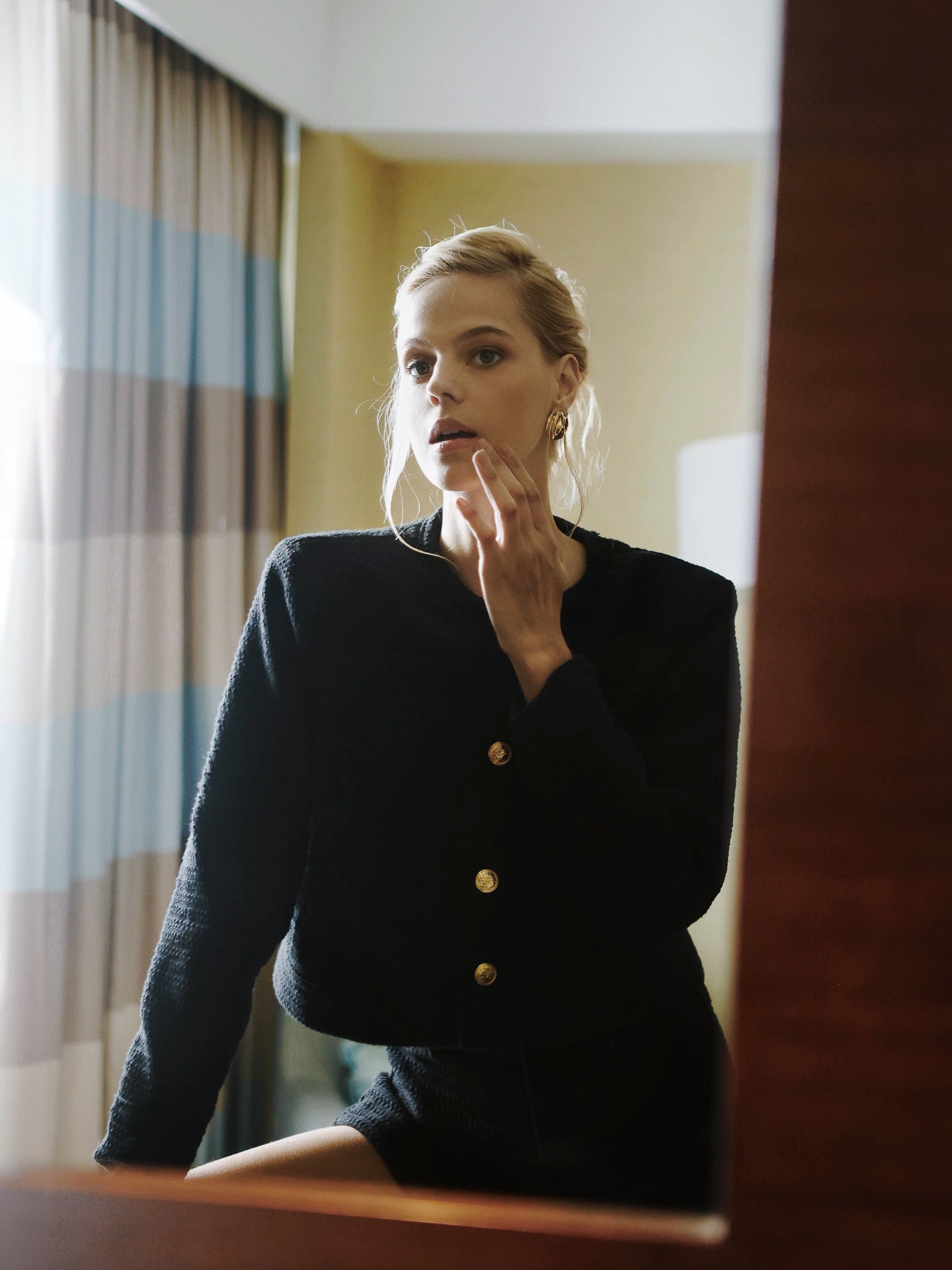 Casaco confeccionado em tweed estruturado, com caimento encorpado e textura marcante. Possui comprimento médio, forro interno e fechamento frontal por botões dourados com acabamento trabalhado. A peça mantém a mesma base têxtil do short de tweed, criando possibilidades de composição coordenada com sofisticação.