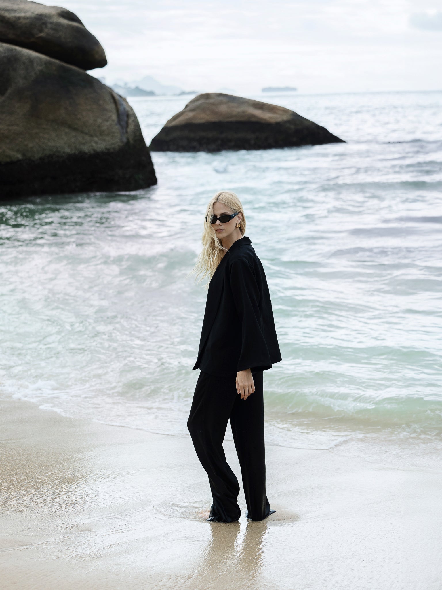Confeccionado em linho puro, o kimono de modelagem ampla oferece movimento e leveza, com acabamento limpo e caimento natural. A calça, também em linho puro, apresenta cós baixo com amarração frontal e elástico embutido, combinando conforto e sofisticação despretensiosa. A textura do tecido reforça a proposta tátil da peça, ideal para composições que exigem elegância silenciosa.