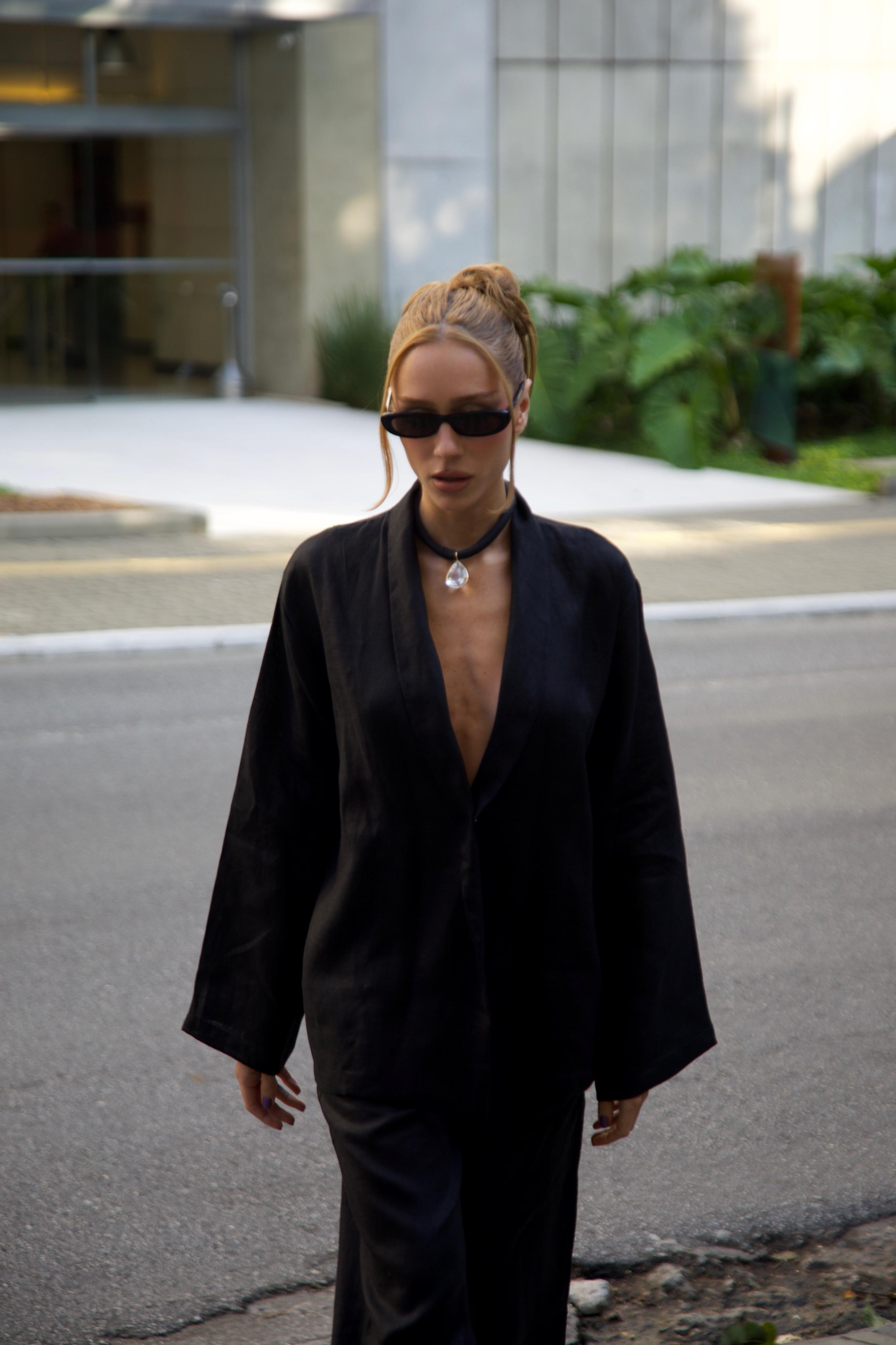 KIMONO PRETO DE LINHO PURO COM CALÇA DE AMARRAÇÃO