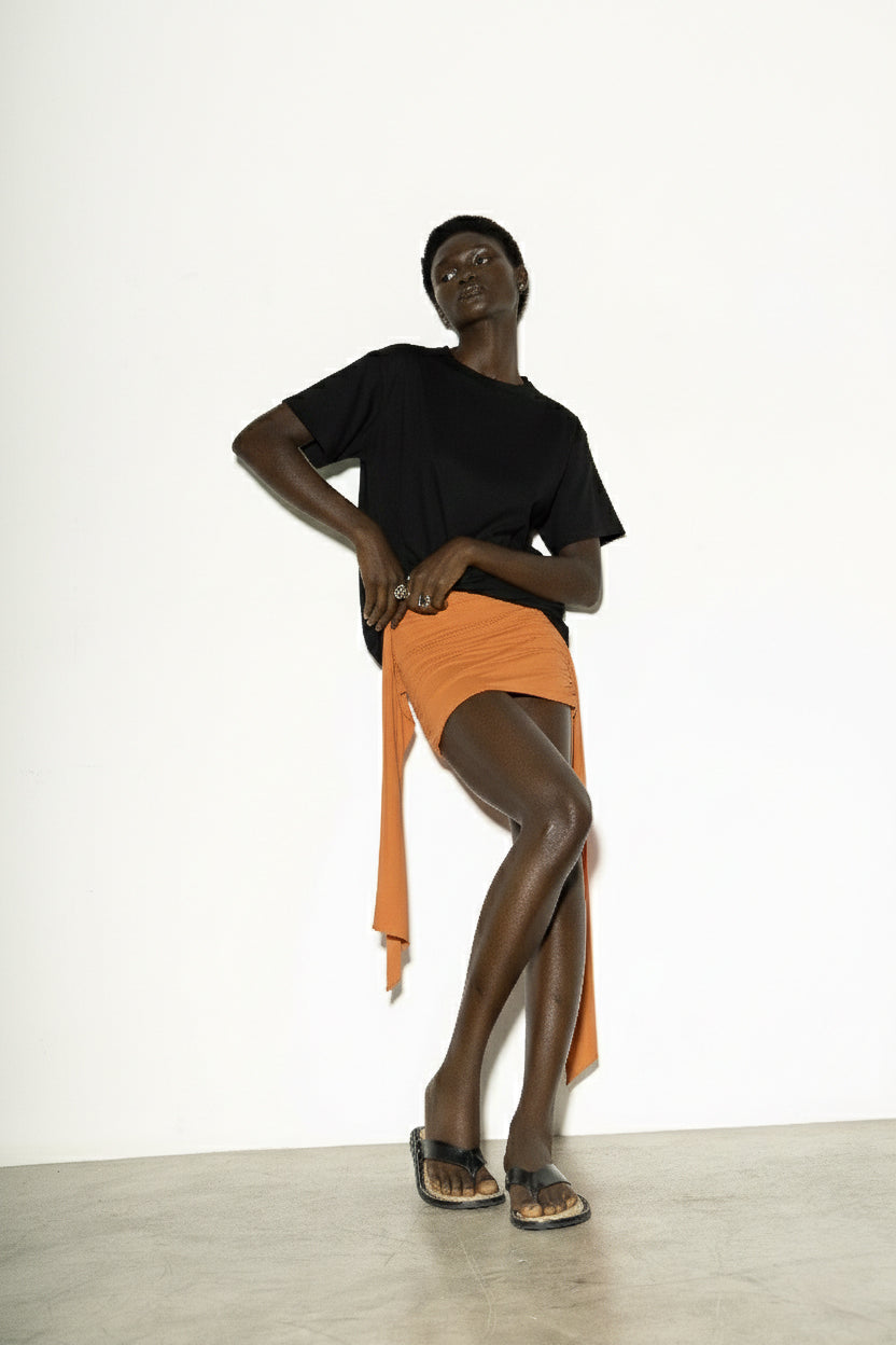 Saia confeccionada em malha, garantindo leve estrutura e transparência controlada. O modelo curto traz duas faixas laterais  — cortadas a fio — que podem ser usadas soltas, criando movimento orgânico, ou torcidas em um nó frontal para alterar a silhueta e ajustar a intenção do look.