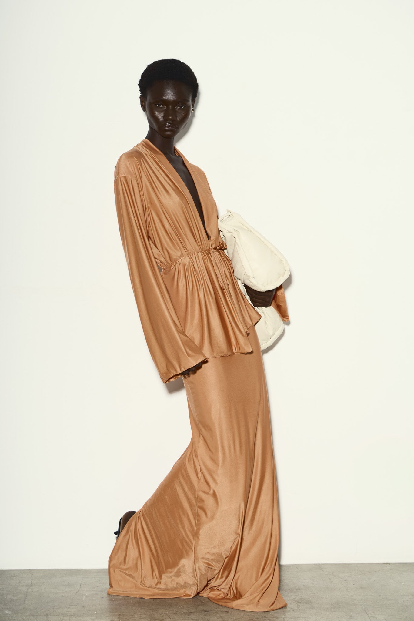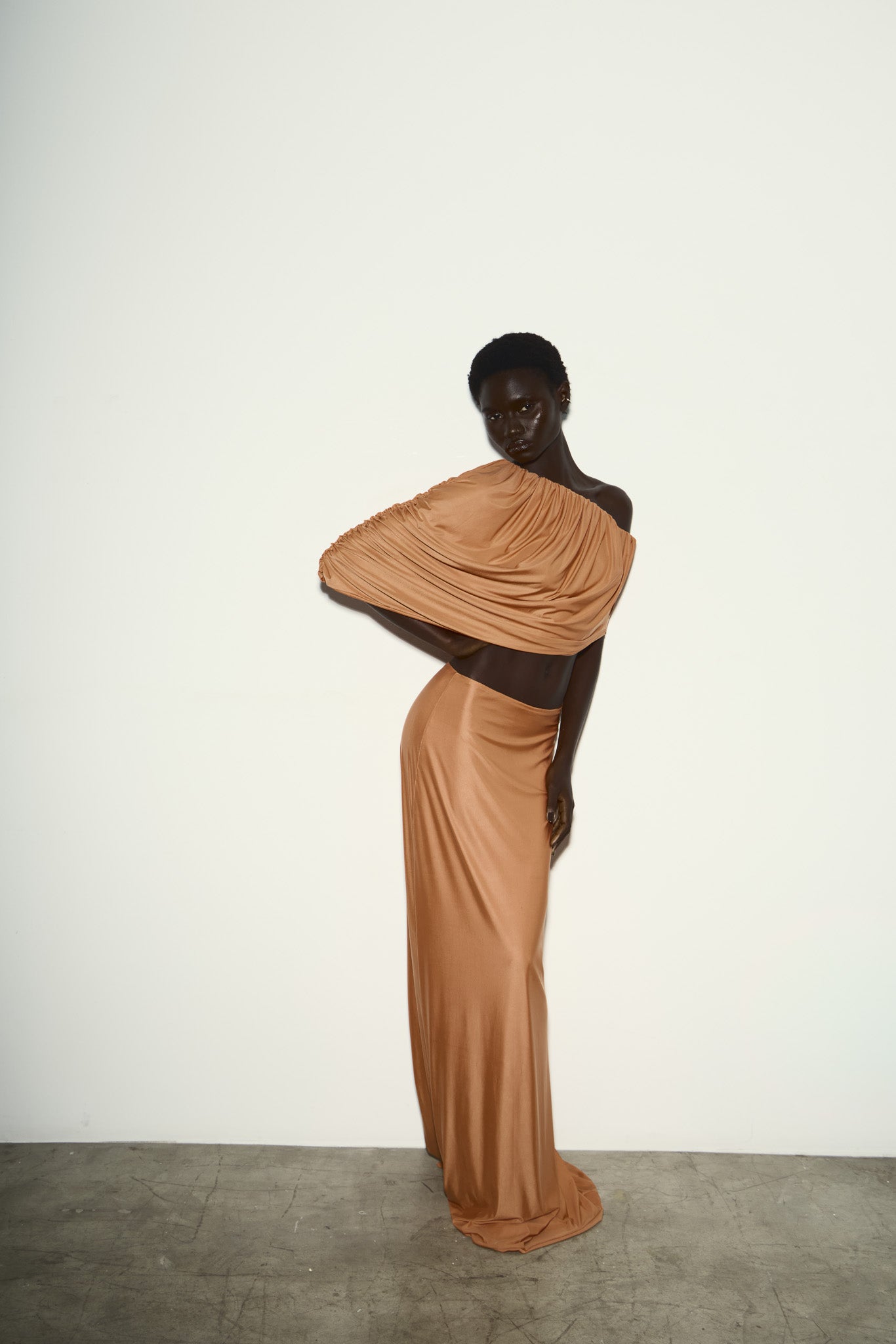 Saia longa confeccionada em malha com estrutura dupla, garantindo opacidade, peso equilibrado e caimento contínuo. O modelo apresenta cós baixo com elástico embutido, criando ajuste confortável sem interferir na linha minimalista da peça.